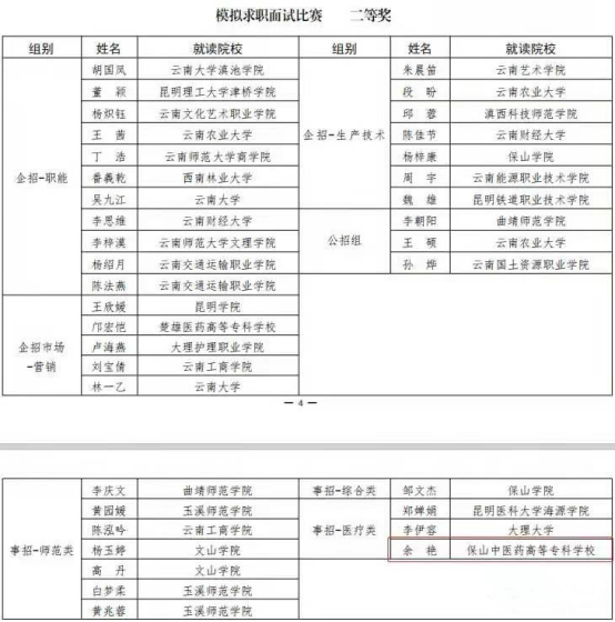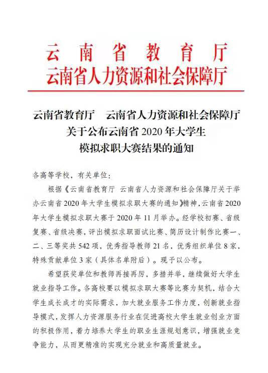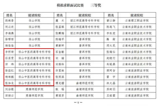 11月27日至11月29日,由云南省教育厅、云南省人力资源和社会保障厅主办,云南工商学院、云南省大中专毕业生就业服务中心等机构承办的云南省2020年“不负韶华,就创未来”大学生模拟求职大赛复赛、决赛在云南工商学院举行。保山中医专代表队成绩突出,勇夺1银6铜。