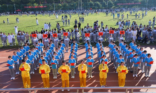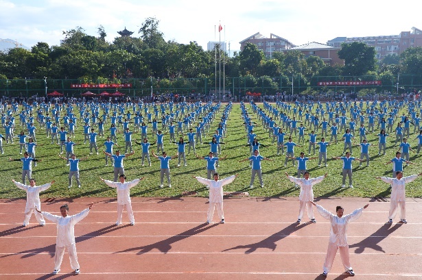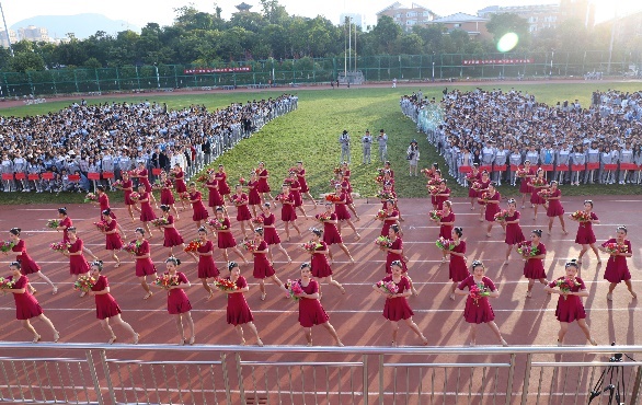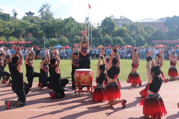 裁判员代表和运动员代表分别进行宣誓,随着黄鹤平书记宣布“国际足联世界杯第九届田径运动会”正式开幕,将开幕式推向高潮。校领导及全校师生一同观看了由师生代表带来的健美操、八段锦、太极拳表演和舞蹈《三声鼓响》。健美操表演的同学们意气风发,迸发出青春无限的魅力;八段锦和太极拳方阵呈现了800余名师生齐练八段锦和太极的壮观场面,尽显中国传统文化的魅力;舞蹈《三声鼓响》表达了师生对学校高质量跨越发展和幸福美好生活的憧憬。