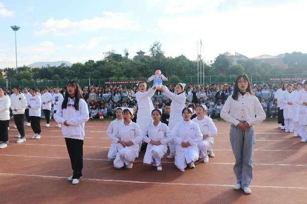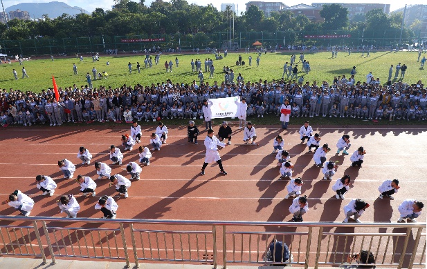 12月3日上午,踏着青春的步伐,伴着激昂的旋律,国旗队、校旗队、红旗队、鲜花队、教职工代表队及18支特色医学专业表演方队统一着装,迈着矫健的步伐,陆续入场。师生们朝气蓬勃、意气风发,他们将入场式表演与本专业医学知识和技能巧妙融合,表现了医学生“健康所系,性命相托”的强大责任感和使命感,展现了一场颇具医学生特色的运动会入场式。