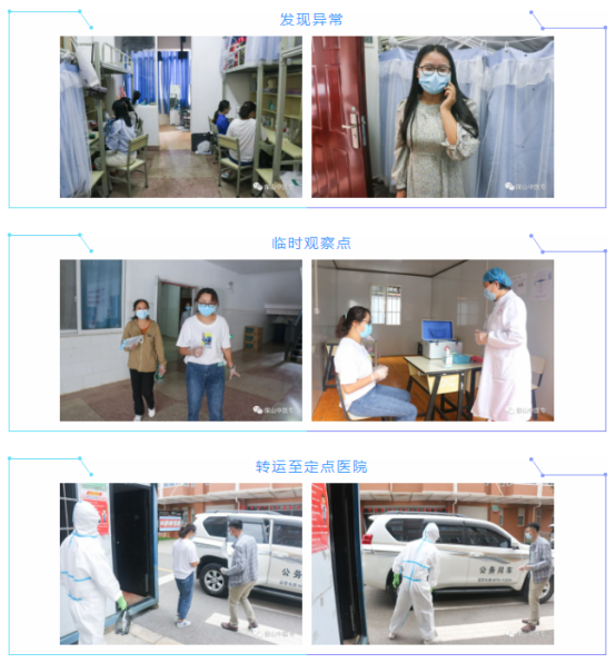 下午18时,某宿舍内有学生表示身体不适,咳嗽,宿舍长让其测体温,发现该生体温异常,生病学生立即做好防护,佩戴口罩,全宿舍同学暂不离开宿舍,宿舍长拨打电话给宿管员,宿管员做好登记并引导生病学生到临时观察点,联系校医室医生,校医到临时观察点对学生进行二次测温,超过37.3度,立即上报学校医疗保障组,医疗保障组迅速到达现场,对发热患者再次测量体温,初步询问流行病学史、旅居史,初步研判该患者可能为疑似病例,立即上报学校防控领导小组,启动应急预案,随即联系值班驾驶员把患者转运到定点医院发热门诊诊治,并开展消毒、隔离、拉警戒、同宿舍同学心理疏导等工作。
