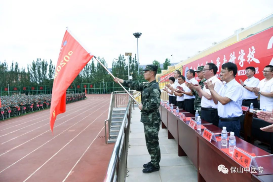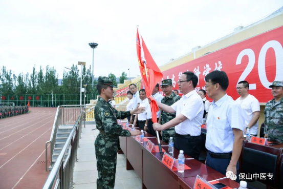 黄鹤平书记为学校2020级军训团授军旗。全体学生军训宣誓。