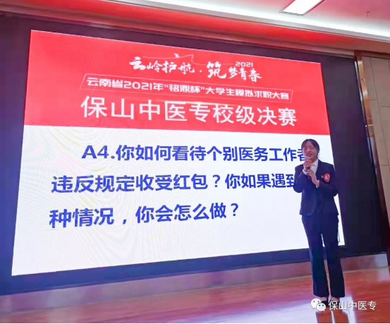 为进一步提升学生综合素质,全面增强学生求职竞争力,11月16日,保山中医专2021年度“铭鼎杯”大学生模拟求职大赛校级决赛落下帷幕。
