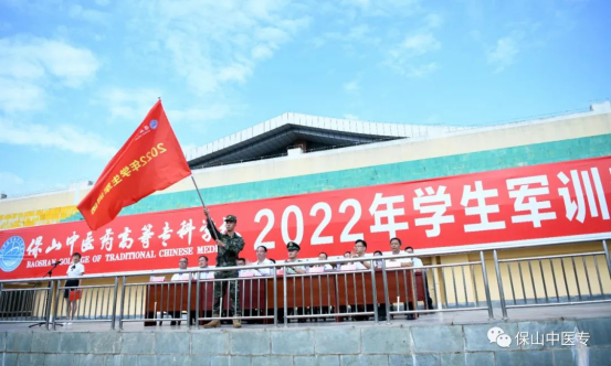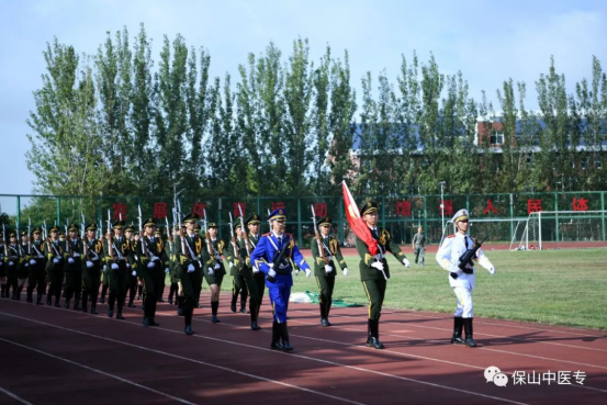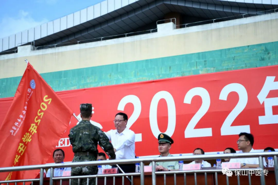 黄鹤平为学校2021级普专、2019级五年制大专军训团授军旗,全体学生进行军训宣誓。