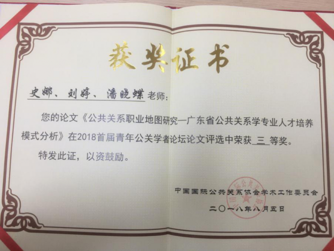 8月5日,2018中国公共关系研究工作坊暨首届青年公关学者论坛在贵州民族大学举办,中山大学南方学院公共管理学系史娜老师、刘婷老师和潘晓蝶老师的论文《公共关系职业地图研究—广东省公共关系学专业人才培养模式分析》...
