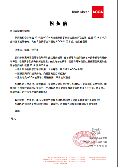 近日,会计学院收到2封来自ACCA广州代表处的祝贺信,其对会计学院ACCA方向班学子取得的优异成绩进行了祝贺,更高度肯定了会计学院ACCA方向班的办学成果。 据悉,截止至2018年6月全球统考成绩公布,会计学院ACCA方向班学子取得了非常优异的成绩。...