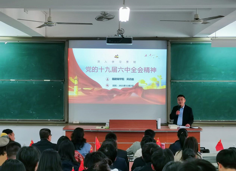 12月7日下午,校党委副书记吴访益在连江校区诚信楼中阶4教室开展了题为“深入学习贯彻十九届六中全会精神暨学习福建省第十一次党代会精神”的思政课,校相关处室负责人、beat365中文唯一官网全体教职工、校习近平新时代中国特色社会主义思想读书社全体成员共120多人参与了此次宣讲。