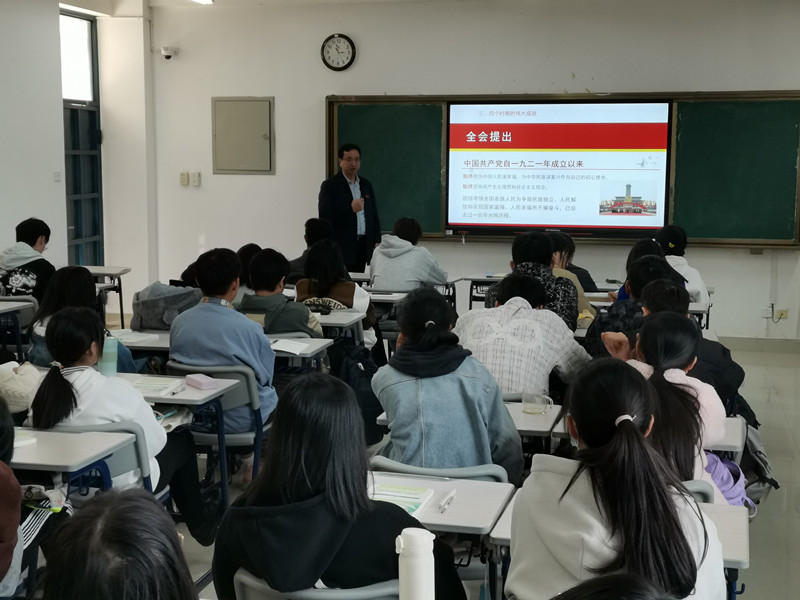 12月8日下午,副校长蒲文庆在连江校区诚信楼405教室为2021会展经济与管理班学生上了一堂《奋斗百年路 启航新征程——学习贯彻党的十九届六中全会精神》的专题思政课。