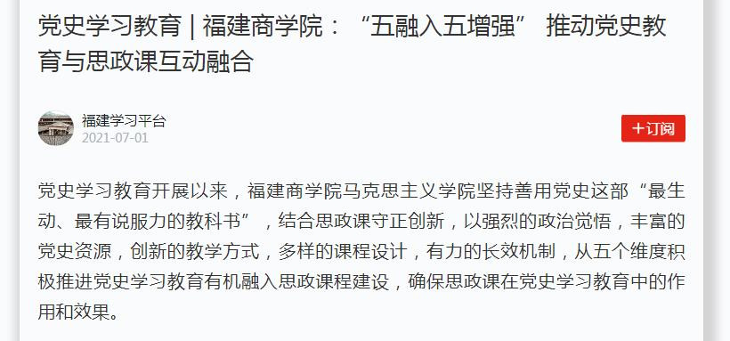 党史学习教育开展以来,福建商学院beat365中文唯一官网坚持善用党史这部“最生动、最有说服力的教科书”,结合思政课守正创新,以强烈的政治觉悟,丰富的党史资源,创新的教学方式,多样的课程设计,有力的长效机制,从五个维度积极推进党史学习教育有机融入思政课程建设,确保思政课在党史学习教育中的作用和效果。