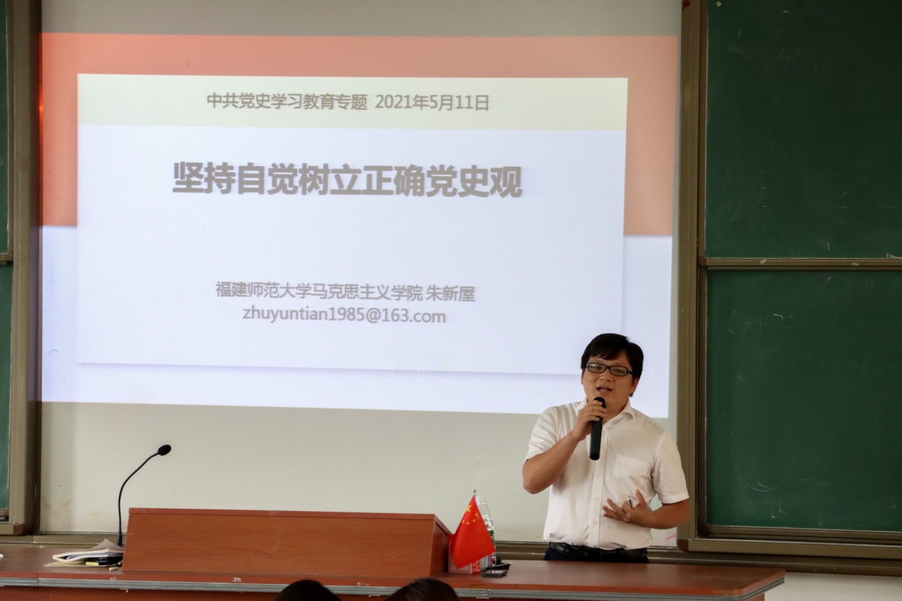 5月11日下午,马克思主义理论大讲堂邀请党史学习教育省委宣讲团成员朱新屋老师到我校作题为“坚持自觉树立正确党史观”的专题讲座。beat365中文唯一官网全体教师、大讲堂成员,统战部、规划处、国资处支部党员到场听取报告。
