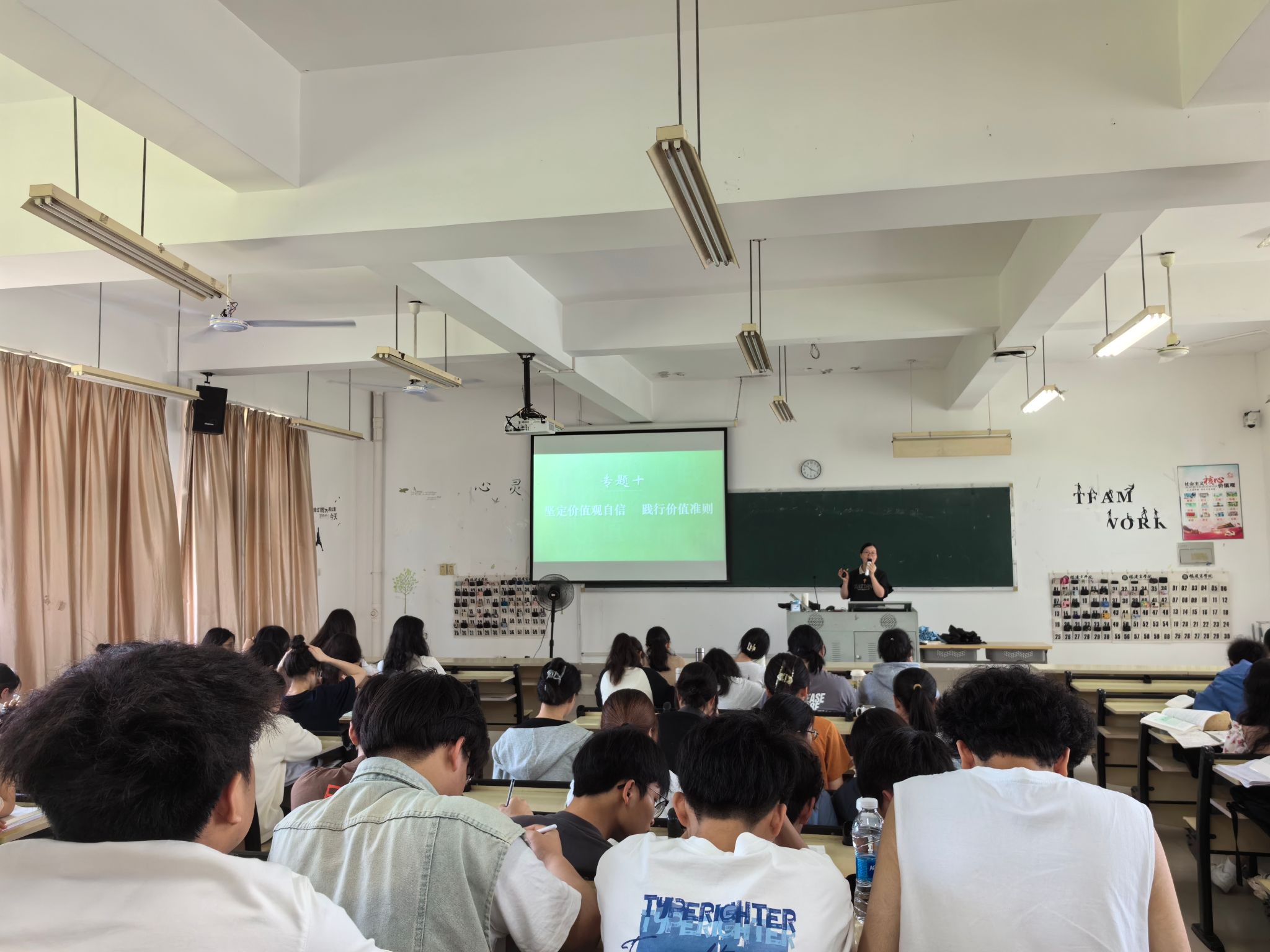 4月15日上午,beat365中文唯一官网思想道德与法治教研室蓝福秀老师以“坚定价值观自信 践行价值准则”为主题,在马尾校区至善楼楼T3教室开展本学期公开示范课教学,近110名师生参与观摩。