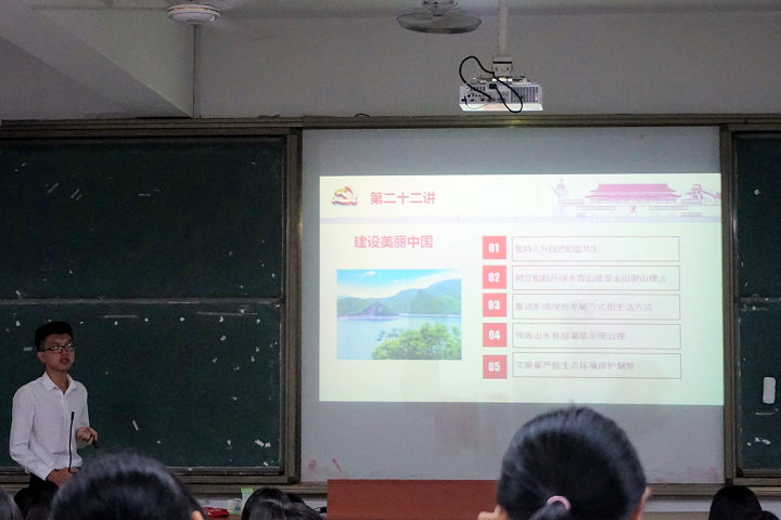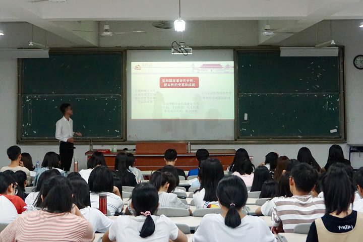 9月26日晚,我校习近平新时代中国特色社会主义思想读书社在连江校区诚信楼大阶一教室开展第二场学生小分队“大宣讲”活动。本次宣讲以“《习近平新时代中国特色社会主义思想三十讲》导读”为主题,由读书社理论骨干宣讲小分队成员、福建省第二季大学生学习马克思主义理论知识竞赛本科组冠军苏金楼同学面向管理工程系2018级会展经济与管理专业的新生进行宣讲。
