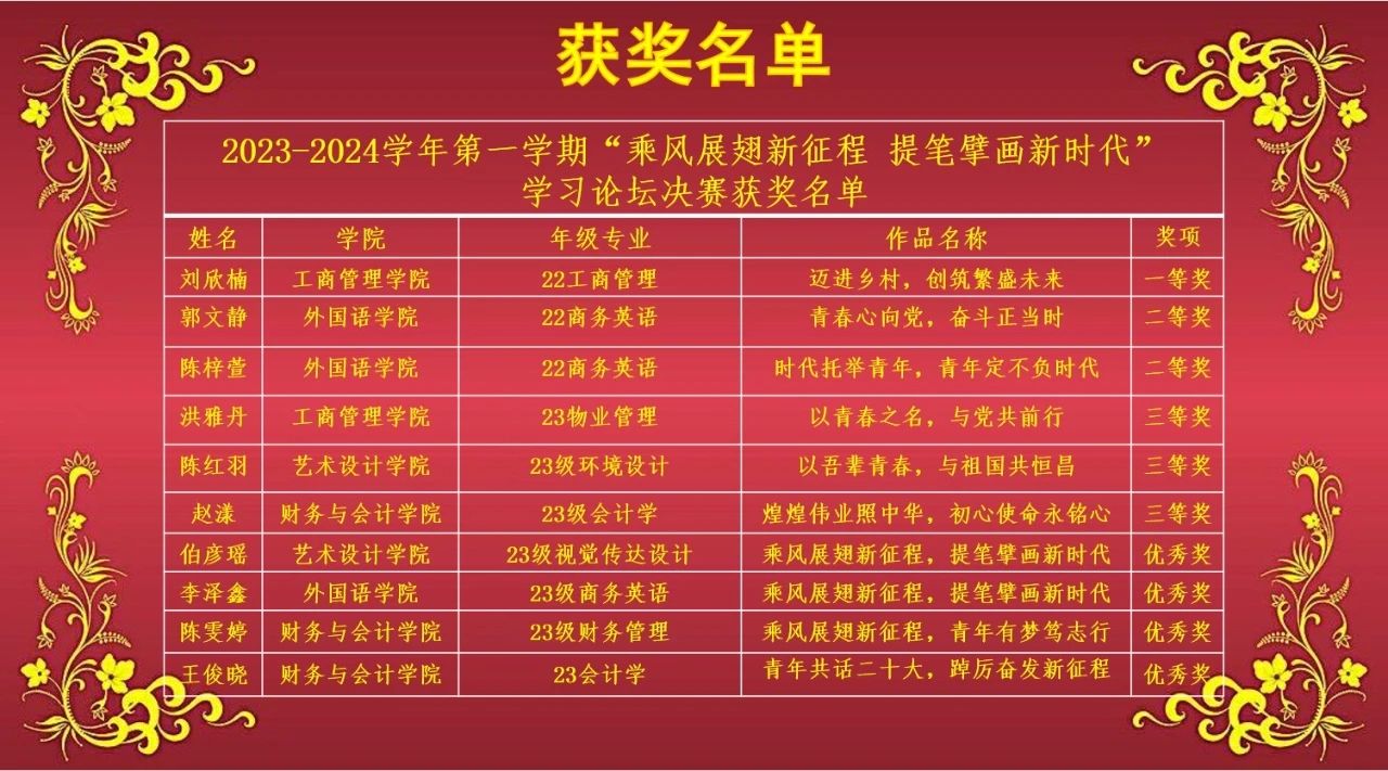 2023年12月5日下午,校习近平新时代中国特色社会主义思想读书社、校马列经典著作读书社在连江校区诚信楼中阶三教室举办了“乘风展翅新征程 提笔擘画新时代”主题学习论坛决赛。beat365中文唯一官网部分教师及校读书社社员逾200人参与了此次活动。