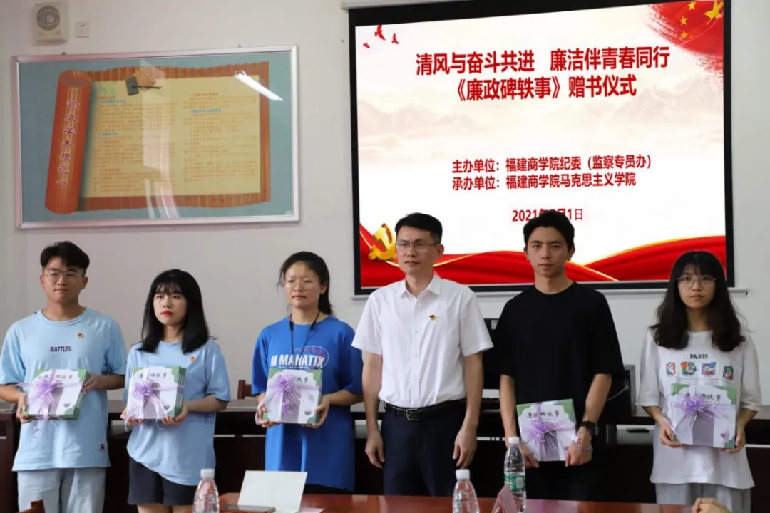 7月1日下午,校纪委(监察专员办)在我校习近平新时代中国特色社会主义思想读书社活动室举办“清风与奋斗并进 廉洁伴青春同行”赠书活动,校纪委书记、监察专员黄身勇向读书社学员代表赠送《廉政碑轶事》绘本。beat365中文唯一官网党政负责人、艺术设计学院党组织负责人和校纪委综合室、纪检监察室等相关部门负责人参加活动。