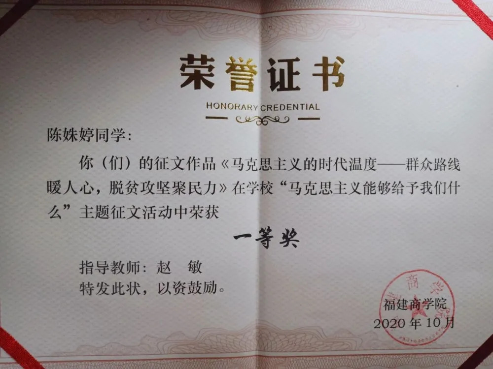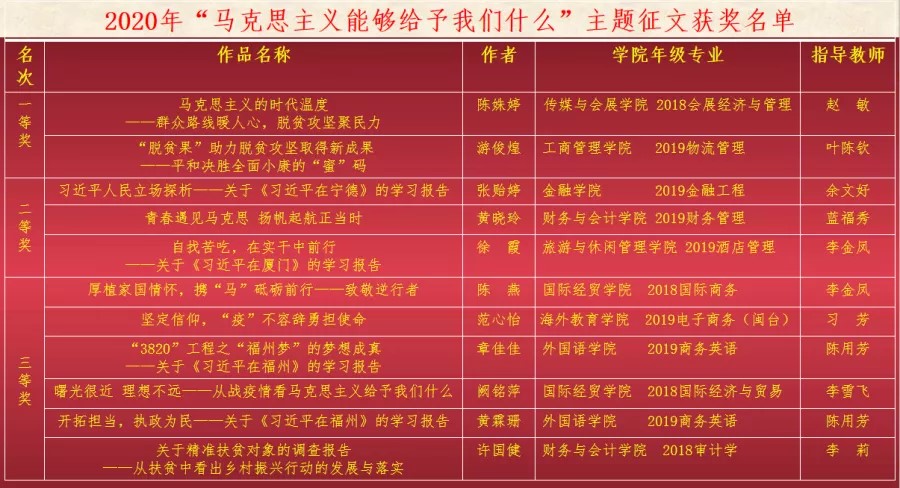 活动自2020年6月开展以来,各学院积极组织学生撰写,至截稿日期,共收到参赛征文80余篇,学生工作部、beat365中文唯一官网等部门组织开展初选、复选,推出11篇参加决赛,经校外专家评审,最终评出一等奖2名,二等奖3名,三等奖6名。其中,推荐前五名参加“马克思主义能够给予我们什么”—第四届福建省高校大学生主题征文和微演讲活动。具体获奖名单如下: