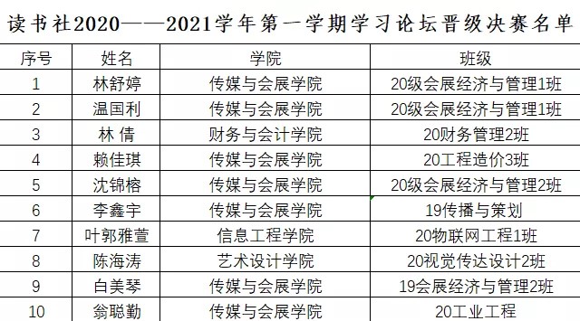 此次活动共评选出10名选手进入学习论坛决赛。具体名单如下: