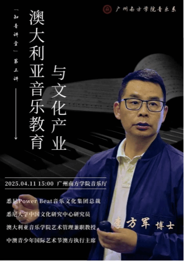 李方军博士,现任悉尼大学中国文化研究中心研究员、澳中音乐产业中心主任,并担任澳大利亚音乐学院艺术管理兼职教授、悉尼Power Beat音乐文化集团总裁,同时主导中国博鳌国际艺术节悉尼总展演及中澳青少年国际艺术节的执行工作。其学术背景深厚,获悉尼麦考瑞大学创意产业博士学位、澳大利亚音乐学院艺术管理硕士学位,以及武汉音乐学院音乐学硕士与学士学位,研究领域涵盖艺术管理、音乐产业及中澳文化融合,尤其擅长音乐产业数字化与跨区域合作的理论与实践。