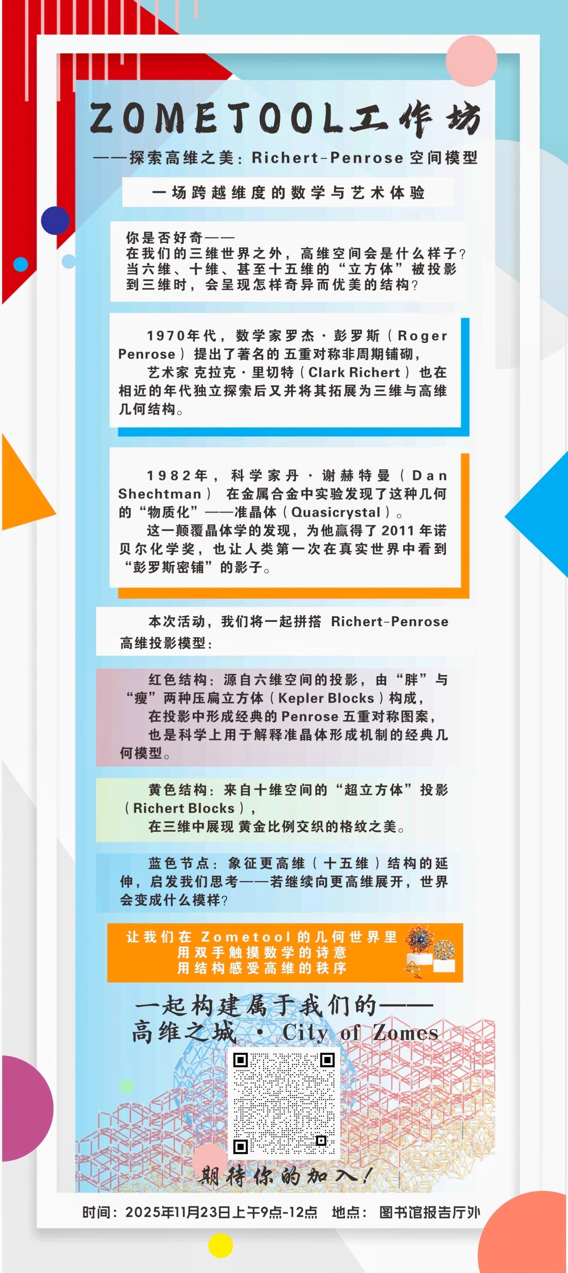 为了让同学们近距离感受数学几何之美,本次论坛在2025年11月23日9点至12点,于格致楼报告厅(图书馆副楼一楼)门口设置Richert-Penrose高维投影模型拼搭活动,在动手实践中探索高维空间的数学奥秘。活动现场将提供全套拼搭材料与专业指导,可扫描下方海报二维码报名参与,名额有限,先到先得。