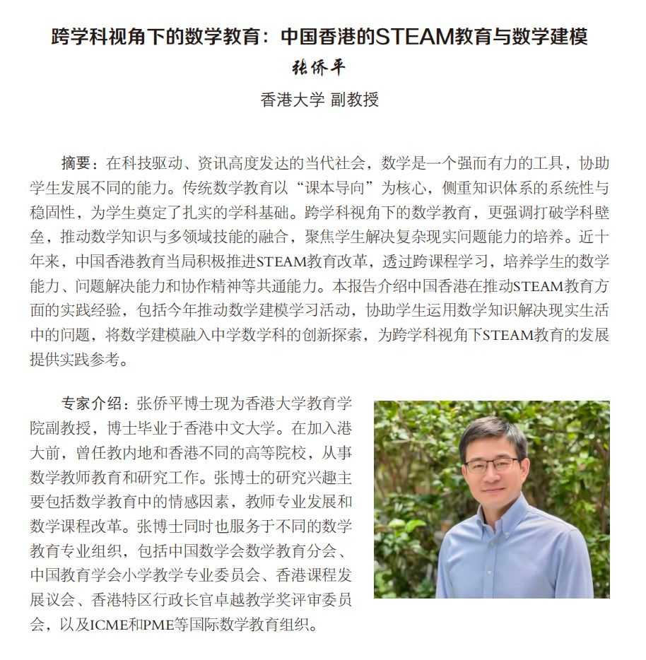 主 题:跨学科视角下的数学教育:中国香港的STEAM教育与数学建模
