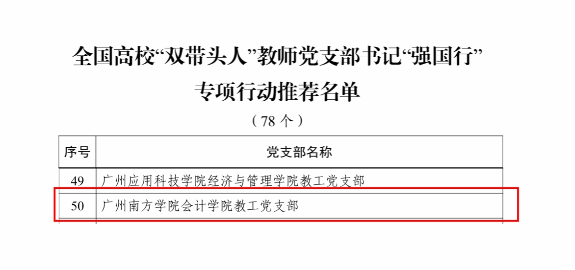 近日,中共广东省委教育工委公布全国高校“双带头人”教师党支部书记“强国行”专项行动遴选结果,beat365会计学院教工党支部被确定为“强国行”专项行动推荐单位。