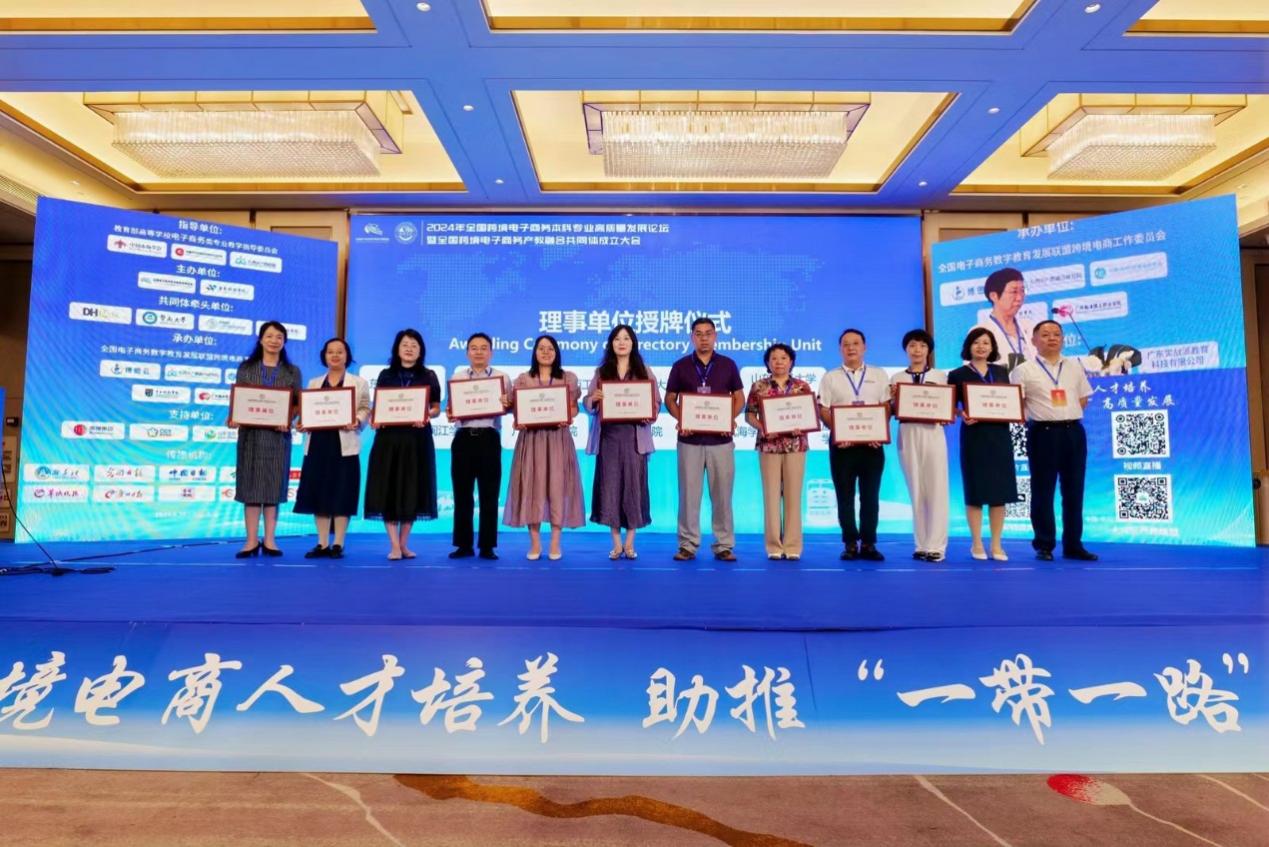 6月20日,在教育部高等学校电子商务类专业教学指导委员会(以下简称“电商教指委”)、中国市场学会、中国对外贸易经济合作企业协会、大湾区产教联盟指导下,2024年全国跨境电子商务本科专业高质量发展论坛暨全国跨境电子商务产教融合共同体成立大会在东莞举行。beat365教务处处长、电子商务专业带头人钟肖英教授及跨境电商课程负责教师陈潇副教授应邀参会。本次大会举办了全国跨境电子商务产教融合共同体成立仪式,发布了共同体的重点建设计划和倡议书,并举行了成员单位的授牌仪式。beat365被正式授牌,成为全国跨境电子商务产教融合共同体理事单位。
