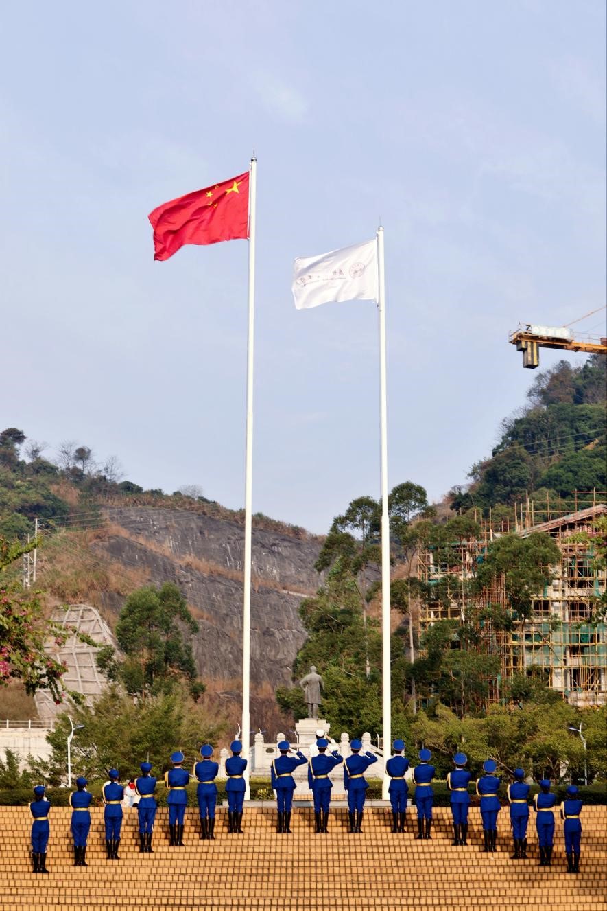 大学生国防教育队的成员们精神抖擞,在嘹亮的口号声中,迈着铿锵有力的步伐,护送国旗、校旗进场。在庄严雄壮的国歌声中,国旗、校旗迎着煦风暖阳冉冉升起。