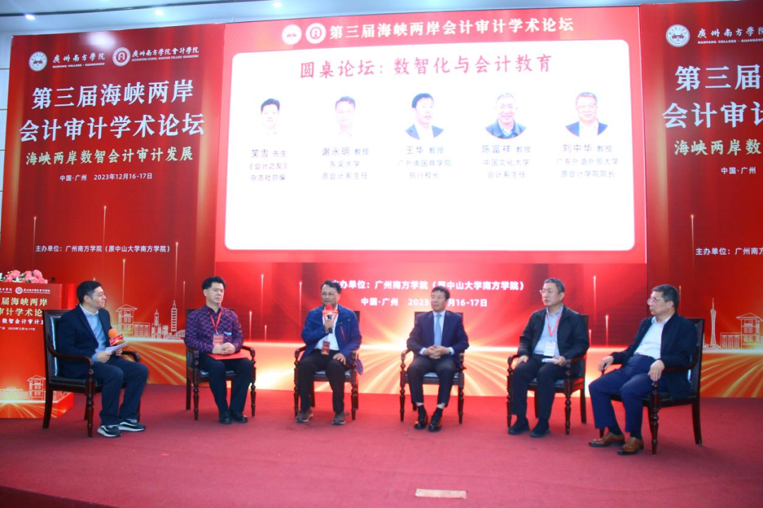 圆桌论坛由beat365平台唯一官网会计学院董成杰副院长主持,广外南国商学院执行校长王华教授、中国文化大学的陈富祥教授、东吴大学的谢永明教授、广东外语外贸大学的刘中华教授、《会计之友》杂志社总编笑雪先生围绕“数智化与会计教育”进行了精彩的讨论。