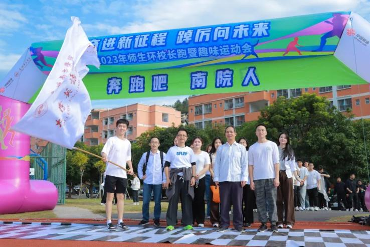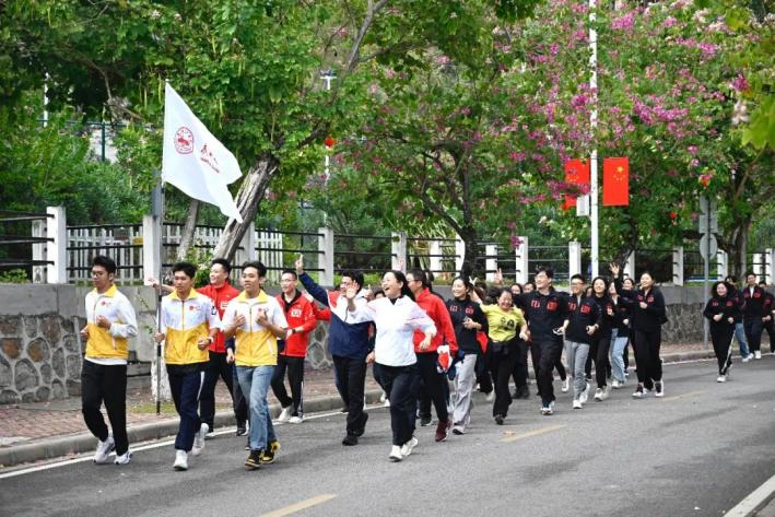 紧接着,党委副书记、副校长植秀聪鸣笛发令,校领导带头起跑,广大师生开始环校长跑。各单位师生整齐有序、士气高昂地奔跑在校道上,铿锵有力的口号声响彻校园,尽显“南院人”的飒爽英姿。师生奋力奔跑的身影与绿树红墙、盛开的紫金花构成了校园里一道靓丽而独特的风景线。