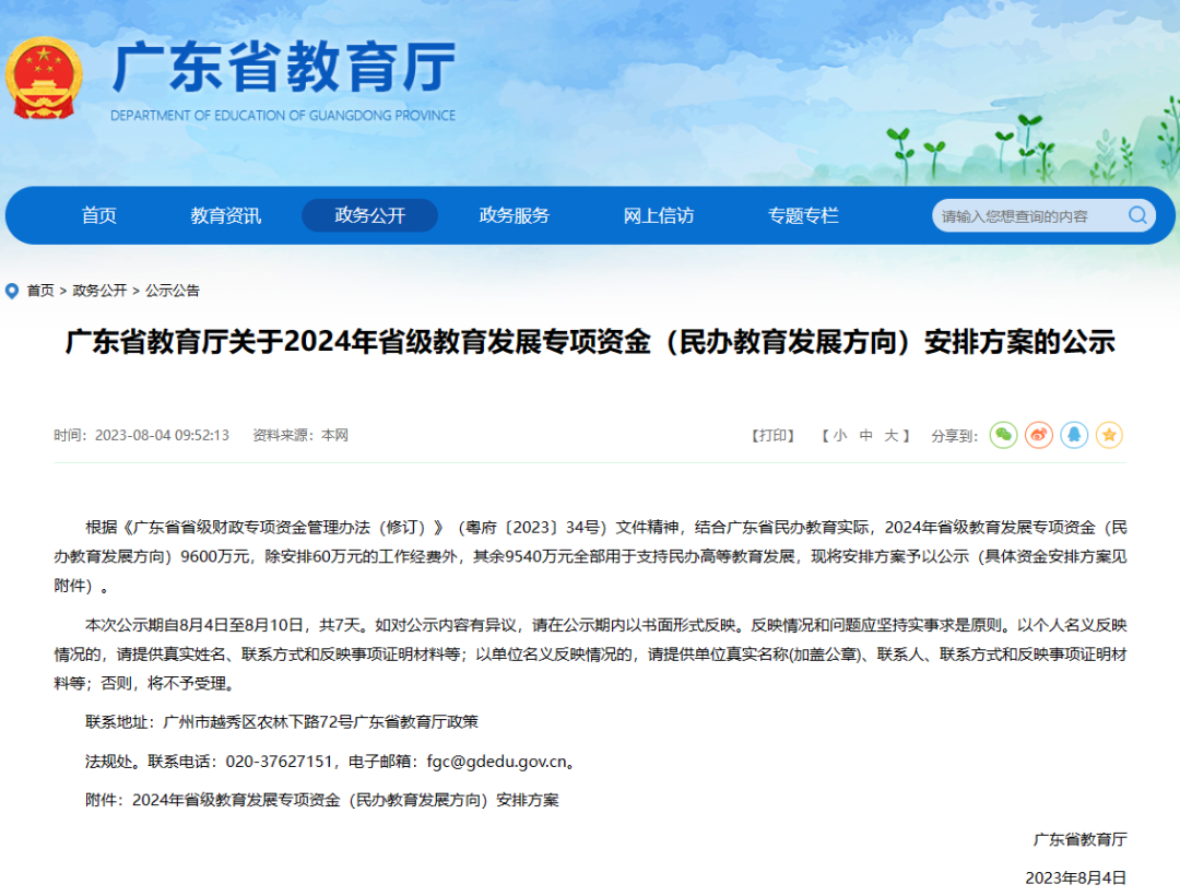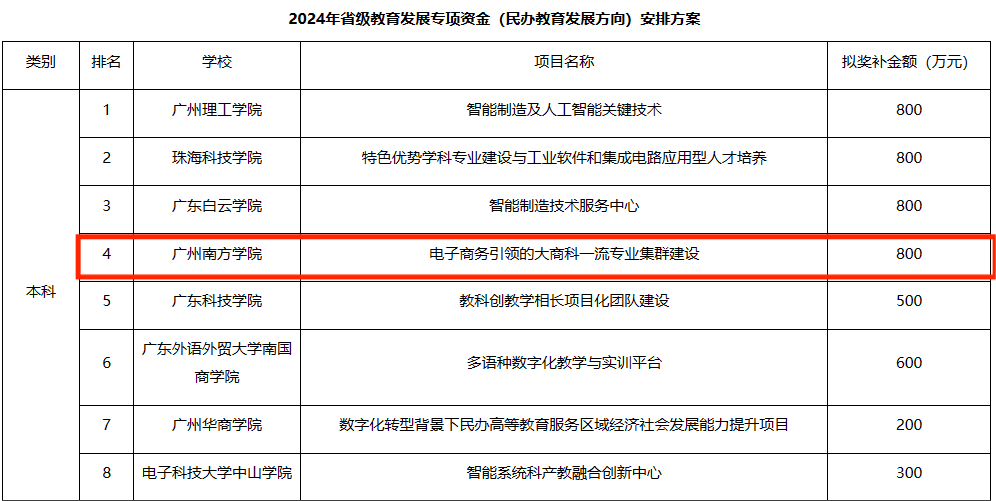 近日,广东省教育厅公示了2024年省级教育发展专项资金(民办教育发展方向)安排方案,其中beat365的“电子商务引领的大商科一流专业集群建设”项目获800万元民办高校最高专项资金支持。