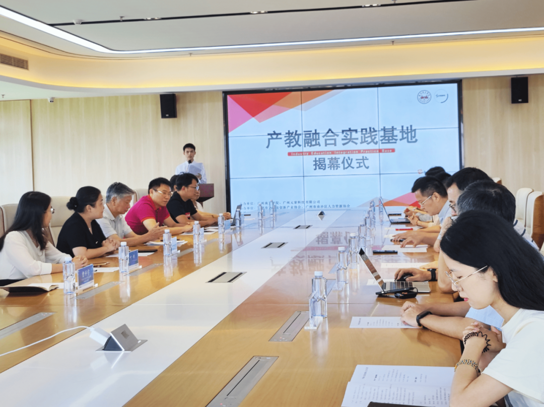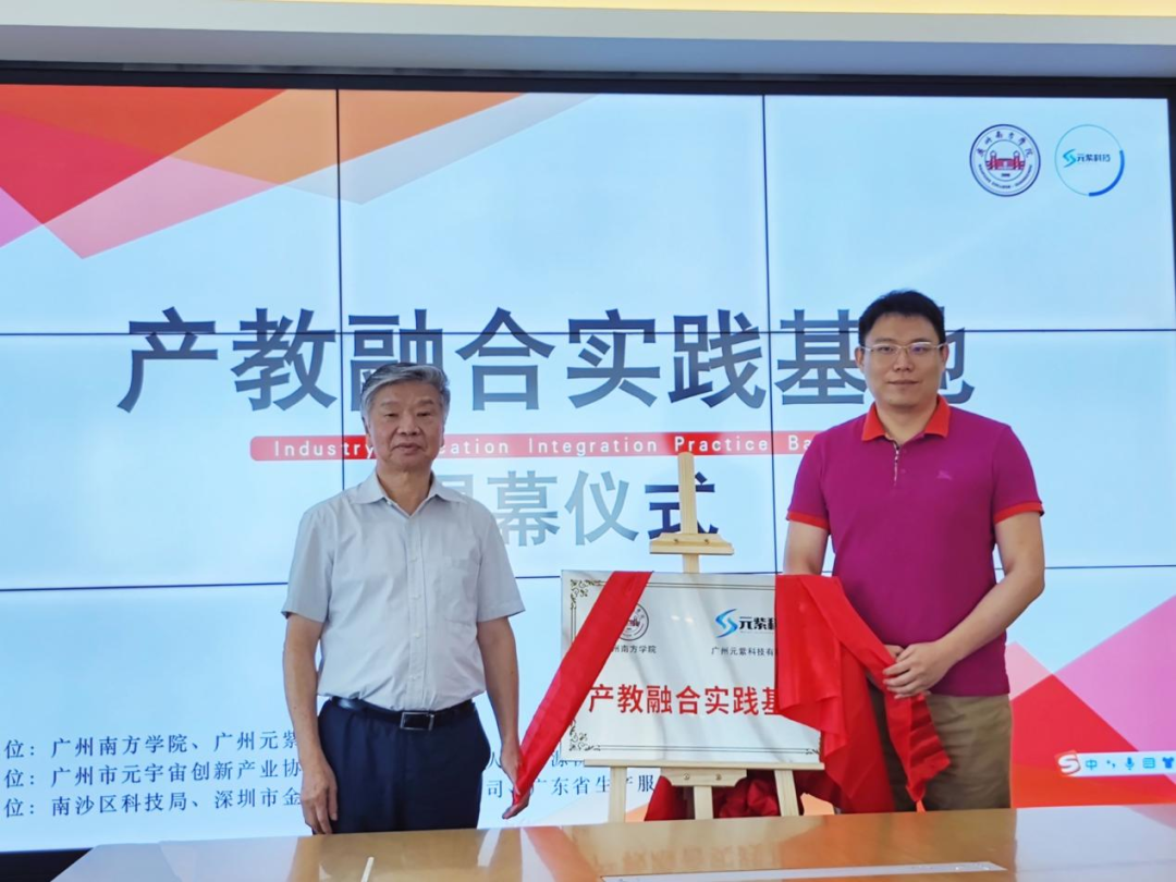 南沙科技局副局长饶志平、科长李鹏杰,深圳市金投基金管理有限公司高级合伙人文勇,广州元紫科技有限公司技术总监陈满森,广东省生产服务业促进会常务副秘书长宇侠,广州市南沙区人力资源协会秘书长张强,广州市元宇宙创新产业协会执行秘书长张怡川、副秘书长李绮琪、副秘书长王毅等嘉宾出席了签约仪式,共同见证了产教融合实践基地的成立与揭牌。