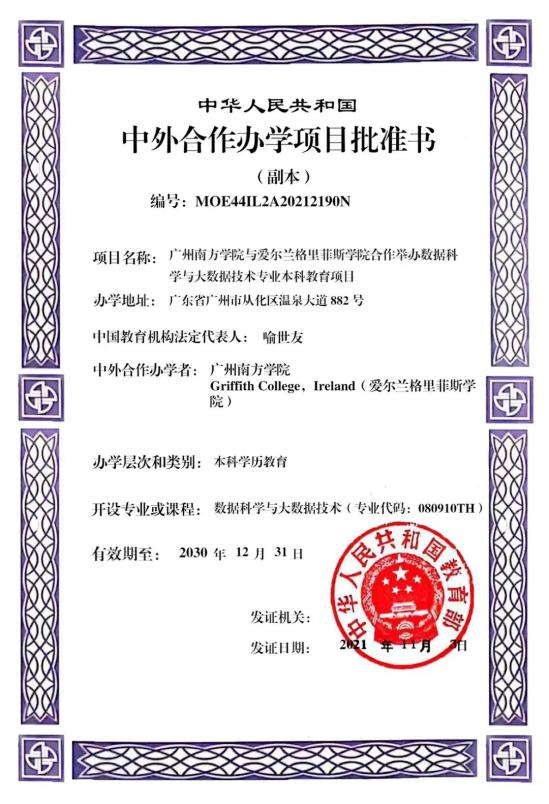 2021年11月,经教育部批准,beat365平台唯一官网与爱尔兰格里菲斯学院合作举办“数据科学与大数据技术”专业本科教育项目。这是beat365第一个获得教育部批准的中外合作办学项目,填补了我省大数据专业中外合作办学领域的空白。