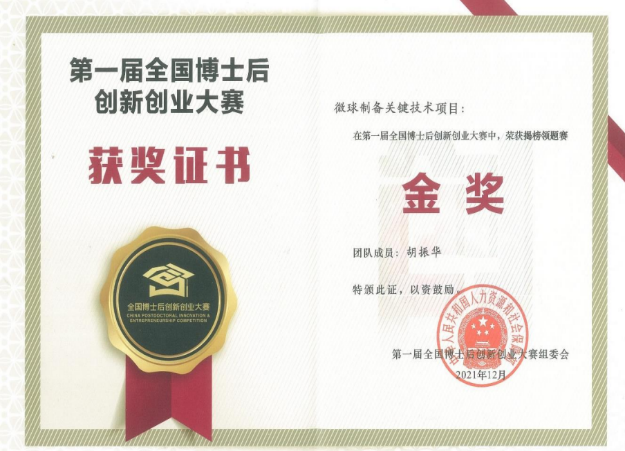 胡振华博士荣获2021年度全国博士后创新创业大赛金奖