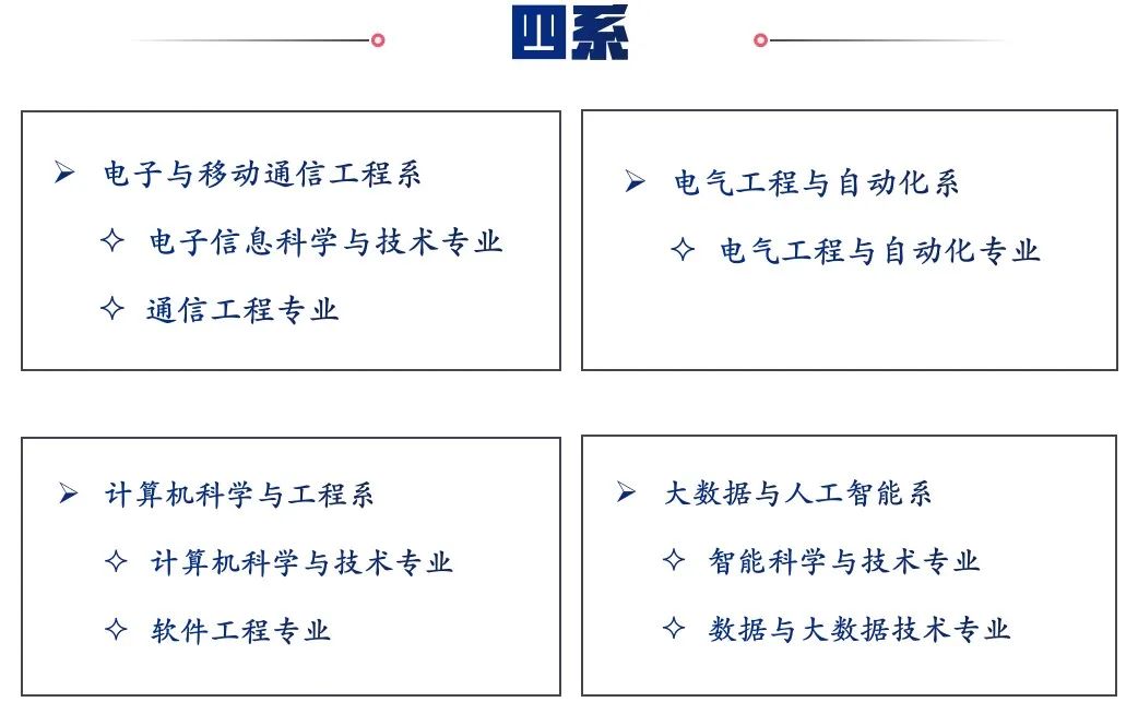 学院现设四系一所:电子与移动通信工程系,电气工程与自动化系,计算机科学与工程系,大数据与人工智能系,信息技术与计算机应用研究所;包含电子信息科学与技术、通信工程、电气工程及其自动化、计算机科学与技术、软件工程、智能科学与技术、数据科学与大数据技术7个本科专业, 开设数据科学与大数据技术中外合作办学项目,目前共有在校生四千余人。