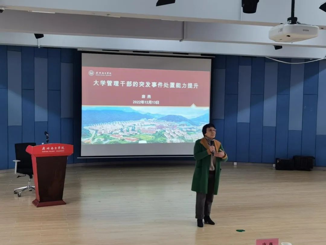 唐燕常务副校长结合学校突发事件案例,分享了在处置校园突发事件时的思考、判断和决策经验。她表示,突发事件的处理过程可以帮助自身得到很好的锻炼和能力的提升。唐燕常务副校长要求,广大管理干部要养成持续学习的习惯,只有持续地学习、思考、历练和总结,才能在面对突发事件时,做到心中有数;要对身边发生的事情建立并保持良好的敏感性。良好的敏感性有助于养成良好的工作习惯,有助于及时有效地提升处置突发事件的能力;中层干部应更多地思考如何做好团队建设和培养年轻干部,积极分享自己的带团队经验和处置突发事件的工作经验,让更多的干部在交流分享中获得提升,将团队培养成螺旋式上升的优秀团队。