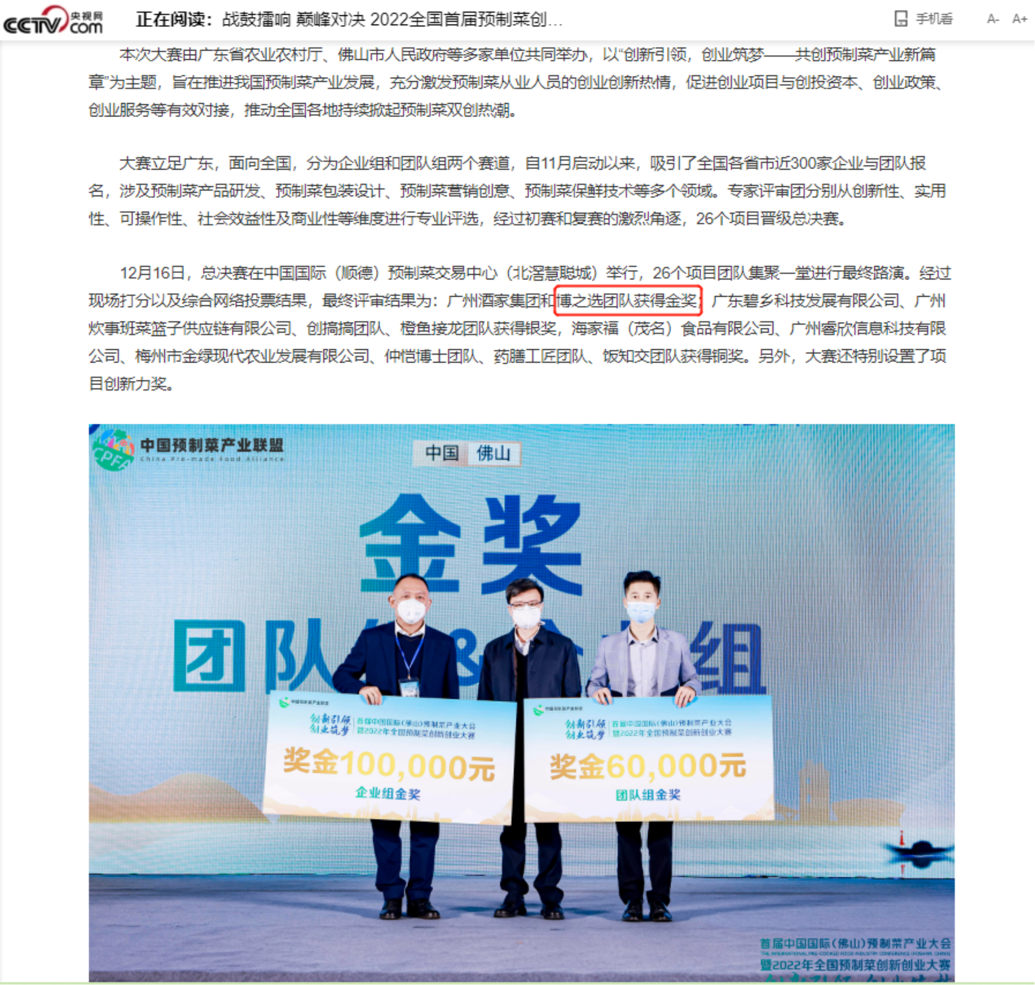 12月16日,2022年首届全国预制菜创新创业大赛总决赛圆满收官。经过现场打分以及综合网络投票,beat365商学院教师陆剑宝、张玉冰带领学生李星穆、谭学轩、陈文韬、陈利莎凭借项目《博之选-广东博士助农预制菜平台》在大赛中脱颖而出,以团队组总分第一名的佳绩,一举斩获总决赛团队组金奖。