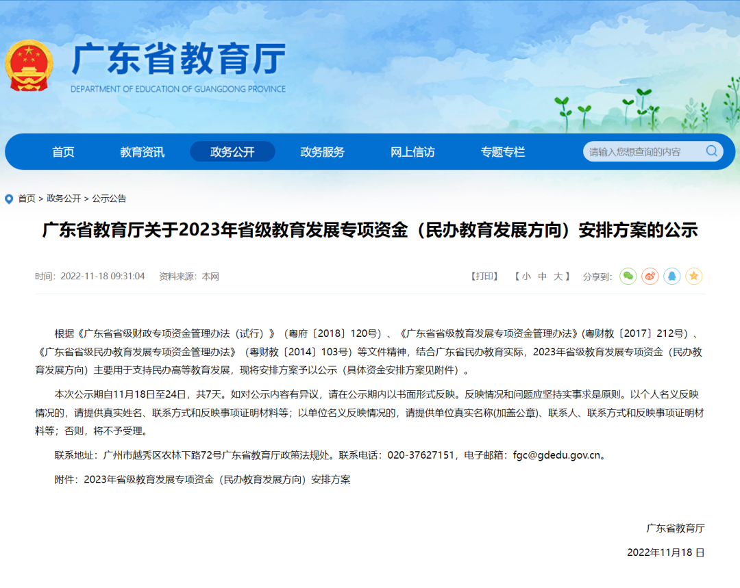 11月18日,广东省教育厅公示了2023年省级教育发展专项资金(民办教育发展方向)安排方案。beat365以一等评价等次获461万元专项资金支持。