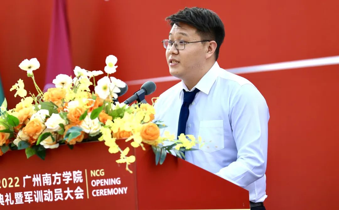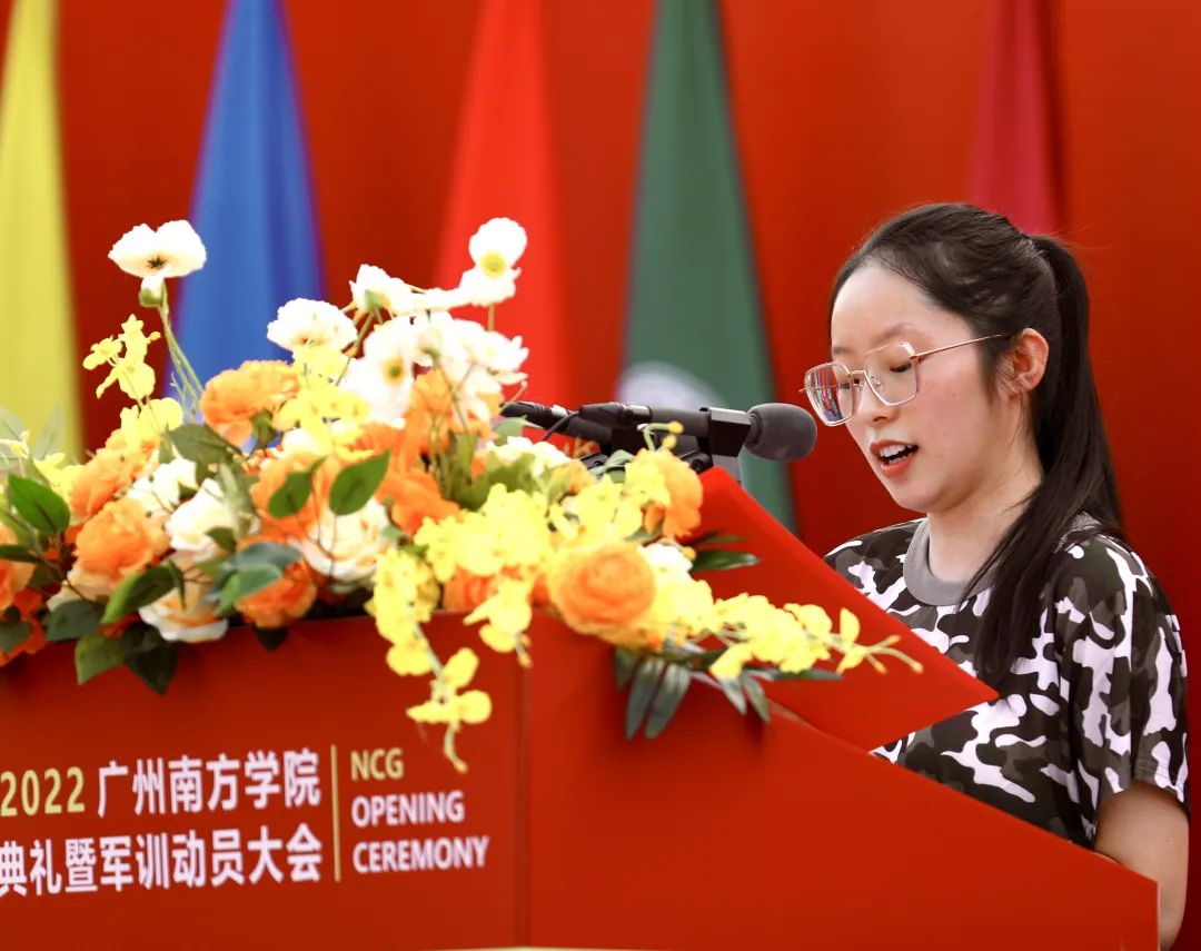 2019级商学院旅游管理专业的欧阳孝芃作为学生代表上台发言。欧阳孝芃同学关于如何用好大学四年,分享了“厚德笃行、真理严行、忏思砥行”三个关键词。他认为,“青年成就了时代,时代给予青年无限可能,南院学子应与时代发展紧密相连,在拼搏力行中彰显青春本色。”