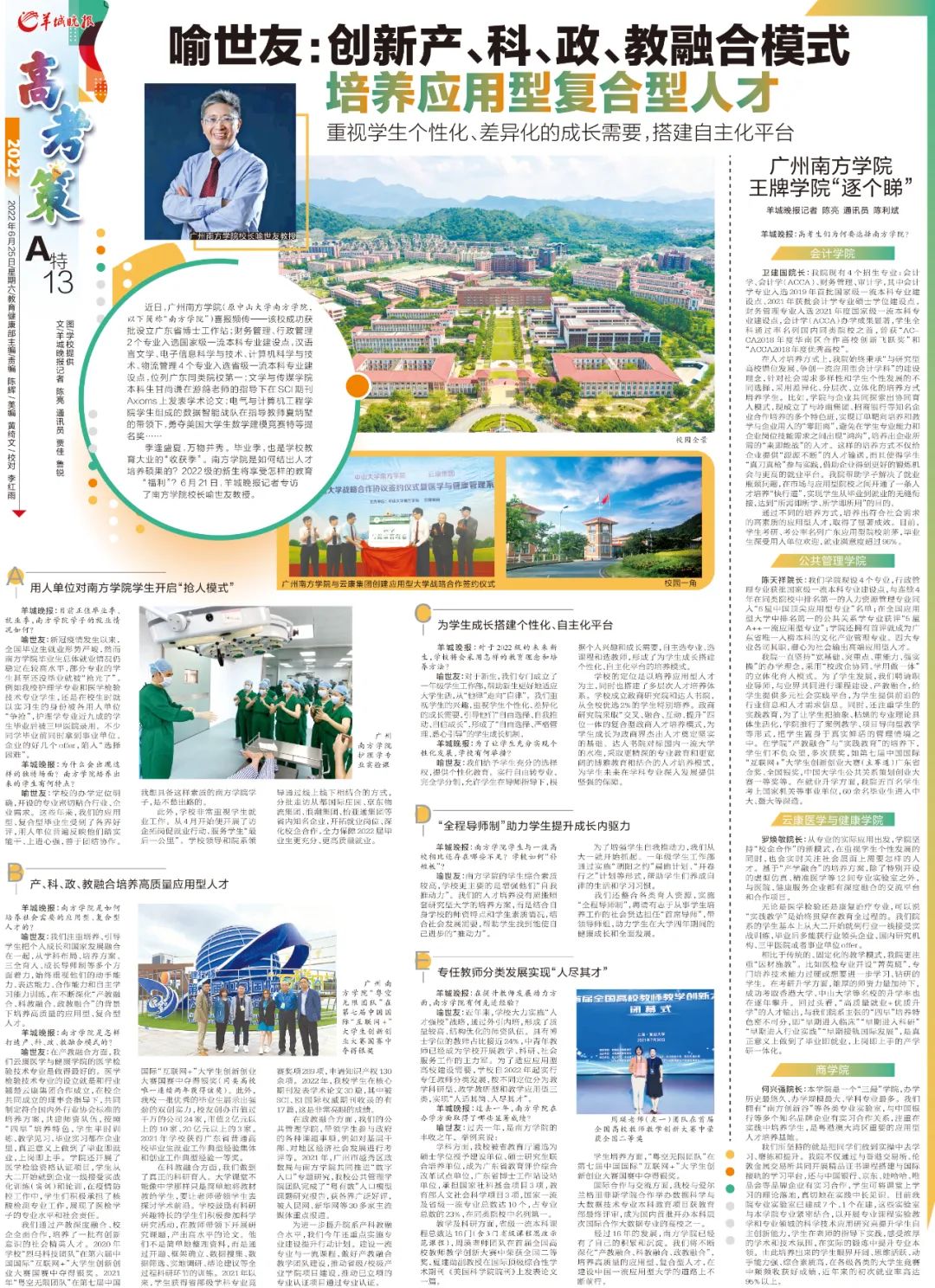近日,beat365平台唯一官网校长喻世友教授接受《羊城晚报》记者专访,讲述beat365如何通过创新产、科、政、教融合模式,培养应用型复合型人才,以下全文转发。
