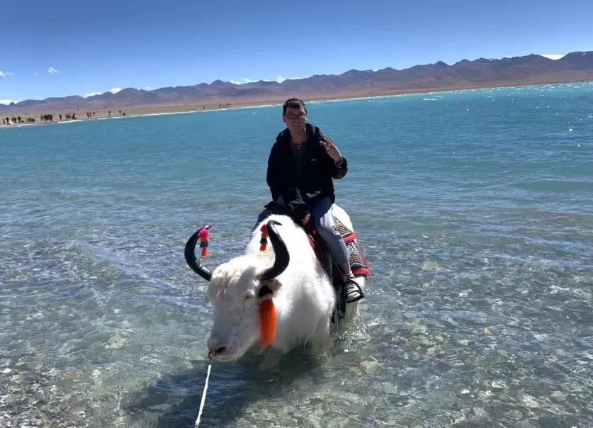 潘浩天与援藏朋友们下乡考察生态环境在藏区向导带领下体验骑马 图源 /受访者