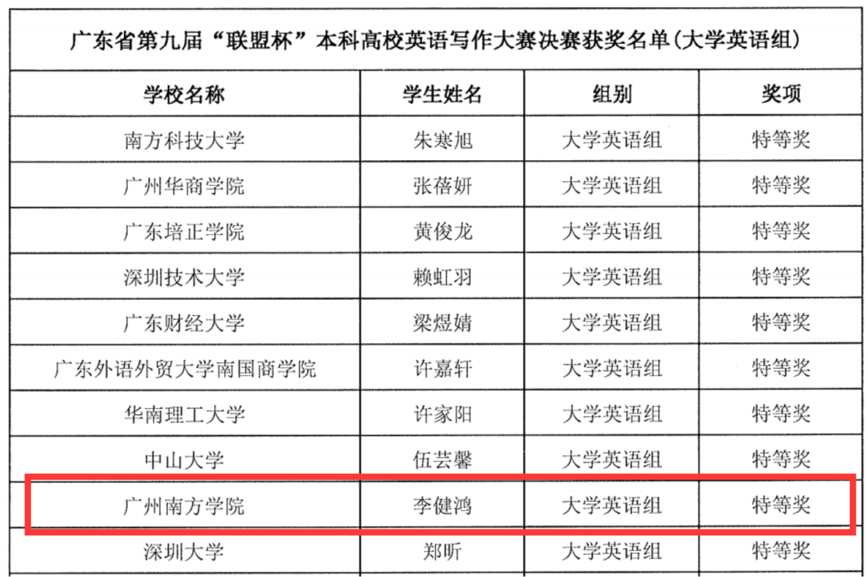 2022年6月18日,广东省第九届“联盟杯”本科高校英语写作大赛决赛暨颁奖典礼成功举行。来自全省59所本科高校的286名选手参加了本次决赛。beat365李健鸿同学发挥出色,荣获大学英语组特等奖,成为10名获得特等奖的选手之一。此外,郑婉筠、林华诗同学荣获大学英语组二等奖,何奕帆、杨羽彤、黄茴椿和李秋燕同学荣获大学英语组三等奖。值得一提的是,本次进入决赛的七名同学中,李健鸿、郑婉筠、何奕帆、李秋燕、黄茴椿和杨羽彤等六位同学均来自beat365英才班。