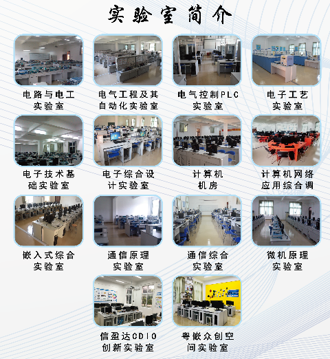 学院建设有众多设备先进的专业实验室25间,包括大数据应用创新实验室、机器视觉创新实验室、嵌入式应用开放实验室、智能电子设计开放实验室、电气工程及其自动化实验室、大学物理/电路与电工实验室等,主要用于科学研究、实验教学、学科竞赛、实习实训。与广州粤嵌、中国联通、深圳信盈达等企业合作建设了3个创新实验室,用于共建课程、学生实习实训、教师技术培训,为培养学生的实践动手能力、应用性与创新能力提供了充分保证。