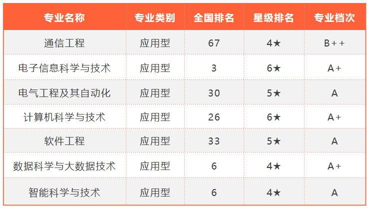 2022年,艾瑞深中国校友会网本科专业排行榜显示,电子信息科学与技术、计算机科学与技术为六星级专业;电气工程及其自动化、软件工程为五星级专业;电子信息科学与技术专业、计算机科学与技术专业、数据科学与大数据技术专业学科水平为A+。