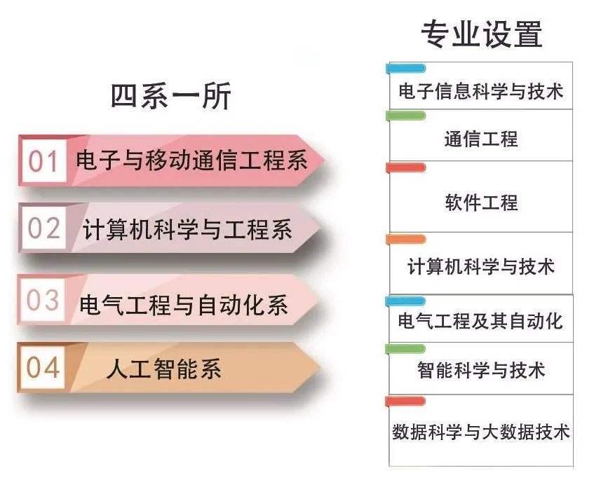 学院现设四系一所:电子与移动通信工程系,电气工程与自动化系、计算机科学与工程系、人工智能系、信息技术与计算机应用研究所;包含电子信息科学与技术、通信工程、电气工程及其自动化、计算机科学与技术、软件工程、智能科学与技术、数据科学与大数据技术7个本科专业,目前共有在校生4022人。