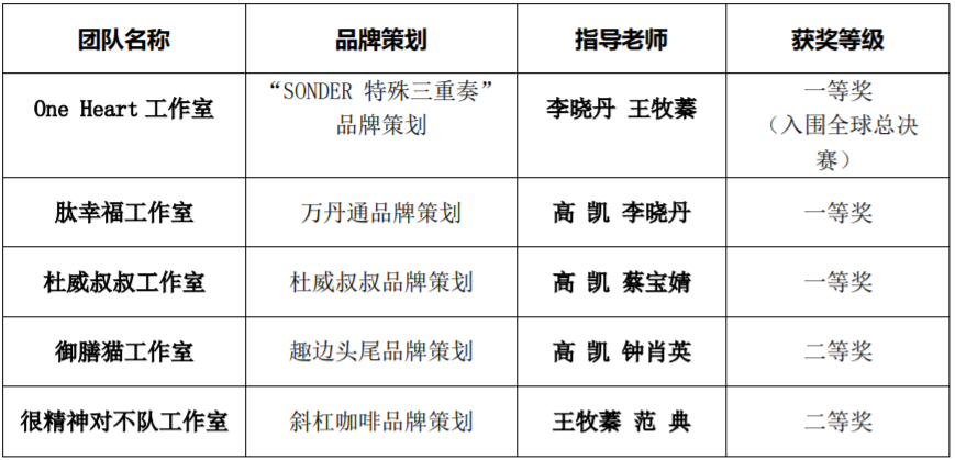 此次比赛获奖,不仅是参赛师生团队积极备战全球品牌策划大赛的成果,更是为响应国家品牌强国战略、树立学生品牌意识、学校培养具有创新思维和实践能力的应用型人才的显著成果。beat365将以此次获奖为契机,继续关注大赛,研究大赛,积极参赛,以赛促学,以赛促教,以赛促建,为建设位居国内一流应用型大学助力。