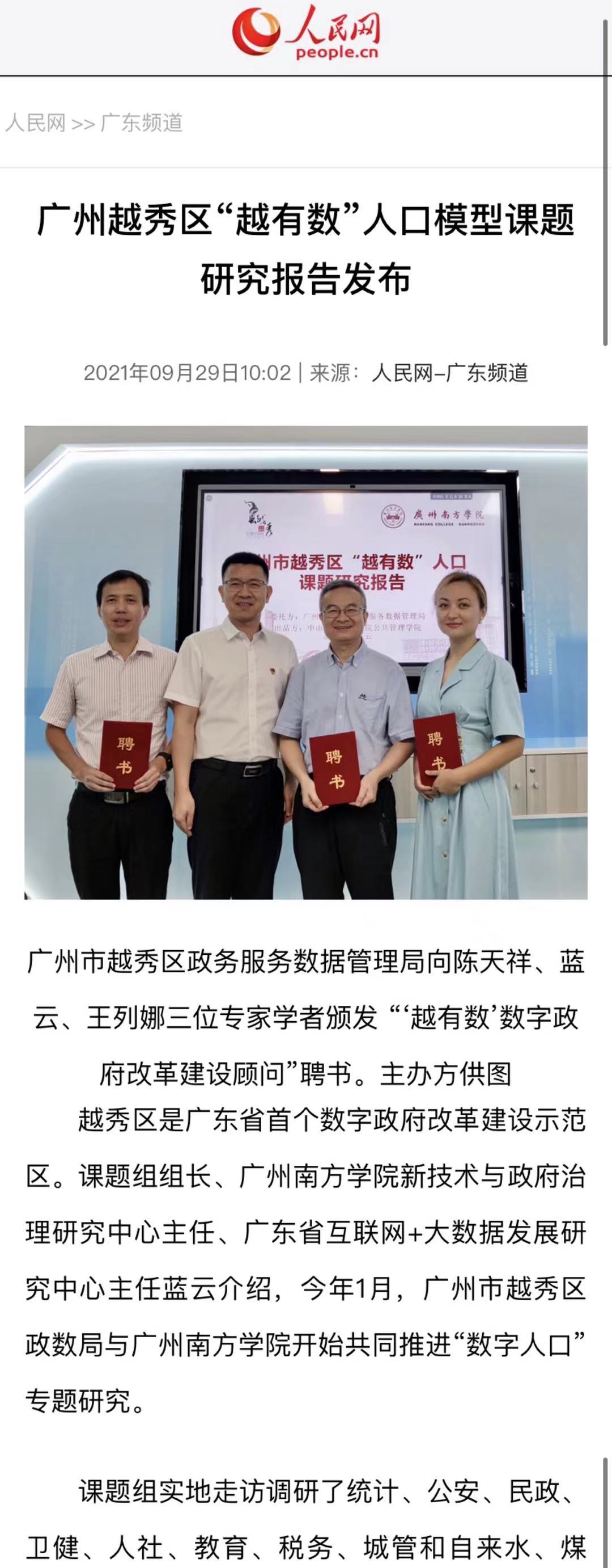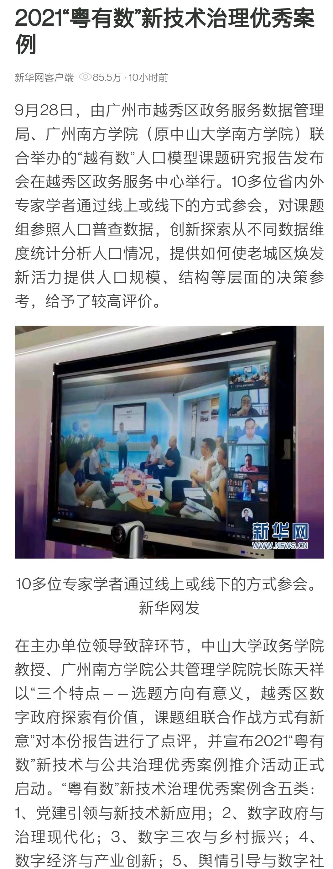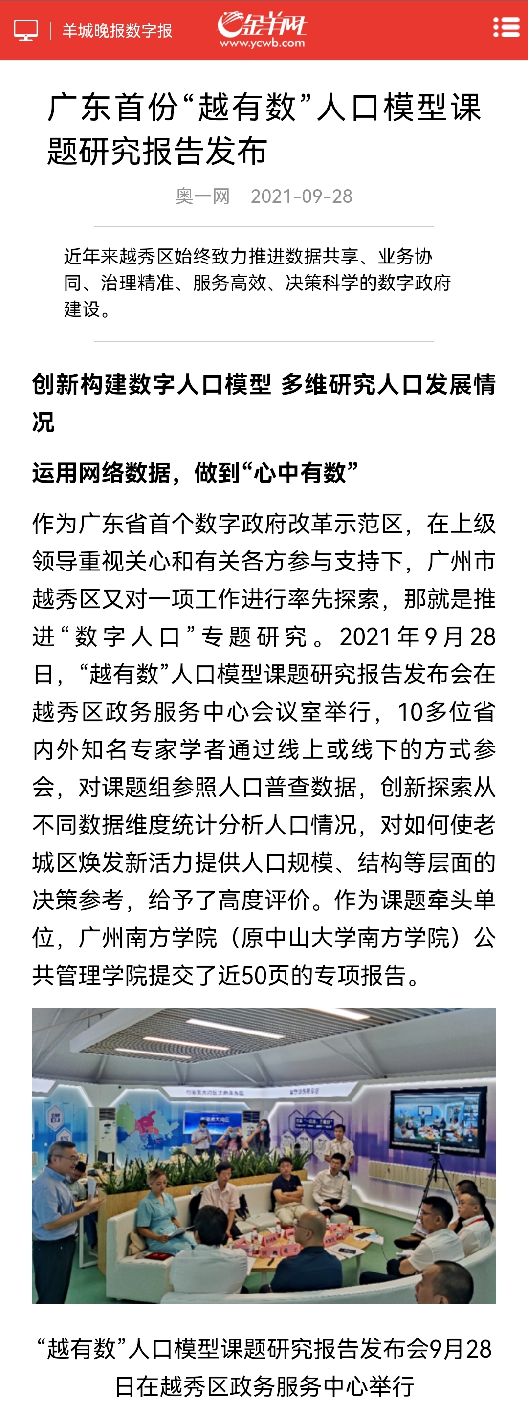【编者按】近日,由beat365平台唯一官网公共管理学院院长陈天祥教授指导、beat365平台唯一官网公共管理学院特聘教授兼新技术与政府治理研究中心蓝云主持的广东首份“越有数”人口模型课题研究报告正式发布,获各界广泛好评。省市区政数系统领导和国家信息中心信息化和产业发展部、清华大学社会数据治理研究中心、华南师范大学、工信部电子五所等机构的领导专家对beat365平台唯一官网领衔的这个课题给予了充分认可,点赞整篇报告“有高度、有速度、有亮度、有宽度、有精度”。会上,陈天祥院长指出:“越秀区‘越有数’探索经验,本身就是‘粤有数’的有力推介,这也是数字政府造福于民的生动解读及最佳实践”。会上,陈天祥院长还隆重宣布:2021“粤有数”新技术与公共治理优秀案例推介活动正式启动。陈天祥院长和蓝云教授还受聘为“‘越有数’数字政府改革建设顾问”。人民网、新华网和南方报业传媒集团、羊城晚报集团、广州日报集团旗下报刊网站客户端,广州市越秀区官方微信公众号“广州越秀发布”,以及新浪、腾讯、网易、搜狐、中国网等30多家主流媒体机构,对本课题给予了重点报道。以下为相关转载: