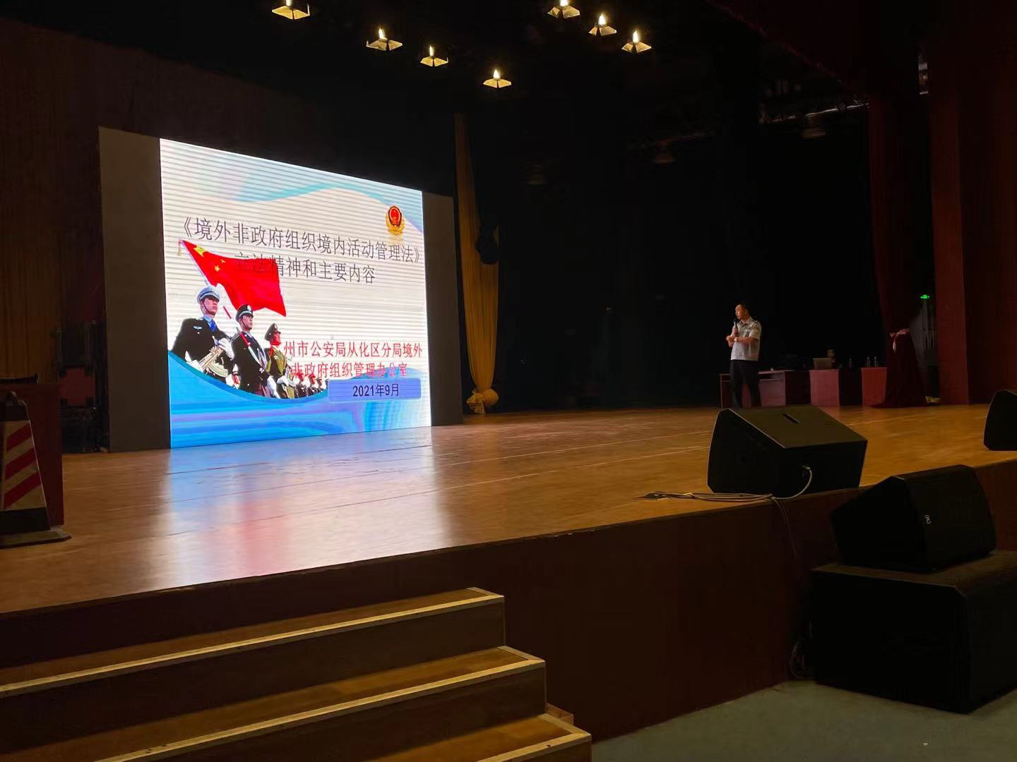 来自从化区公安分局的刘警官,从我国面临的现实国际局势出发,从丰富的国家安全工作经验中梳理、归纳典型案例,重点从境外非政府组织境内活动管理、反邪教工作的实际出发,结合高校领域出现的新情况、新问题,向同学们进行《境外非政府组织境内活动管理》、反邪教相关法律法规普法宣传。刘警官从相关法律法规的制定背景、重点内容、实施与操作的原则等方面进行了详细的阐述,给现场同学们上了一堂生动的国家安全法治教育课。