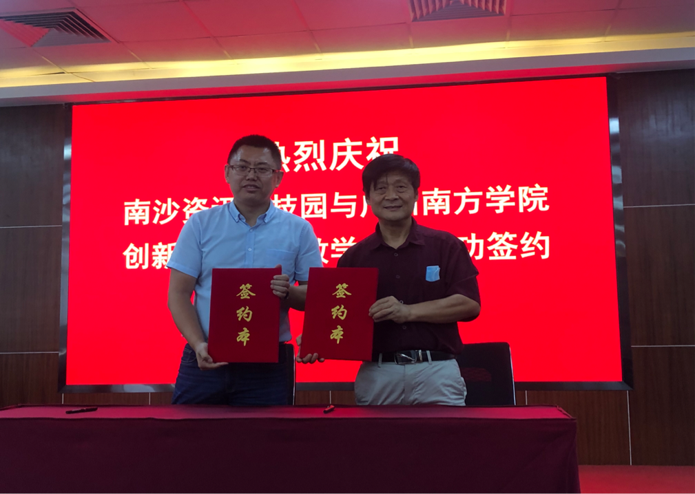 在签约与揭牌仪式环节,卫建国院长与王瑞章总经理分别代表各自单位签署了“创新创业实践教学基地”合作协议。之后,会计学院和南沙资讯科技园的代表将覆盖在“创新创业实践教学基地”牌匾上的红布徐徐拉开,标志着会计学院南沙资讯科技园创新创业教学实践基地正式建立。