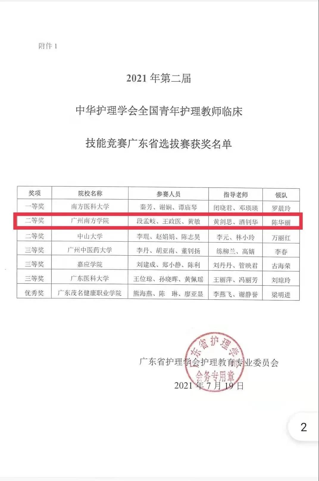 7月14日,由广东省护理学会护理教育专业委员会主办、南方医科大学护理学院承办的第二届中华护理学会全国护理本科院校教师临床技能竞赛广东省选拔赛通过线上方式举行。经学院推荐,我院专任青年教师黄敏、王政医以及来自中山大学附属第三医院的临床兼职教师段孟歧共同组队参赛,领队为我院陈华丽常务副院长,指导老师为中山大学附属第三医院的黄剑思主管护师和中山大学附属肿瘤医院的酒钊华主管护师。