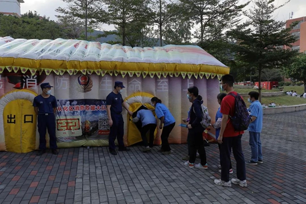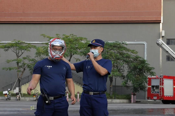 疏散演练后,消防队员们又向参练人员演示灭火器、防毒面具的使用方法,并由参练人员进行灭火器实操训练和消防安全屋逃生体验活动。