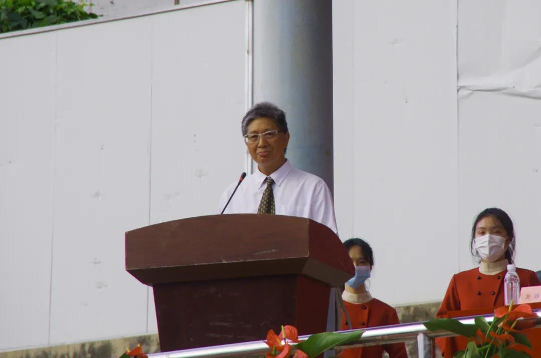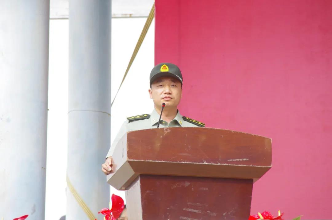 其后,承训单位代表、从化区人民武装部科长周坦锋为新生作军训动员报告。从他铿锵有力的语调中,我们感受到了军人的庄严与魅力。随后,喻世友校长向2020级新生军训团授旗,至此,2020级新生军训正式拉开帷幕。