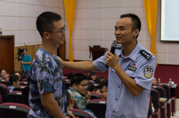 2018级新生安全教育启动仪式后,从化公安宣讲团的熊春林警官为新生们带来安全知识教育讲座。在一个半小时的时间里,熊春林警官用诙谐幽默的语言,向在座新生传授了一系列安全知识和理念。熊春林警官先是结合网络段子、时事热点,引起大家对于日常生活中保护生命财产安全话题的关注,接下来通过与同学们热情互动,以“你认为什么叫做诈骗”、“在我们身边可能会发生什么样的侵害、犯罪”等话题,引导同学们结合身边的案例,分享自己的感受和体验,更加深刻地认识和反思生活中存在的安全问题。熊春林警官还对大学生容易上当的网络刷单、裸贷等网络诈骗,冒充公检法、盗取手机验证码等电信诈骗一系列典型诈骗类型进行了详细讲解,提醒大家要谨记“天上不会掉馅饼,只会掉陷阱”的道理,增强分辨能力,时刻敲响警钟。